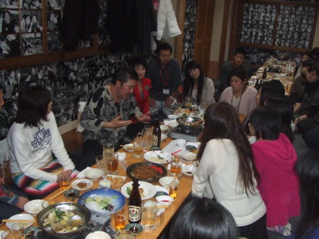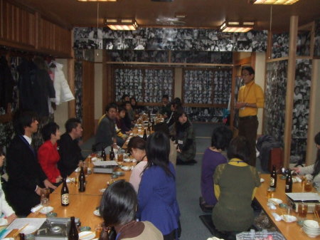 | スタッフの集合写真 | 懇親会は「ガレージ酒場」 |