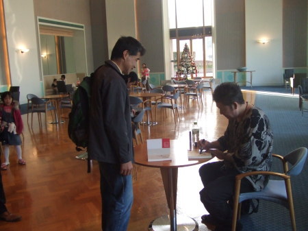 | チーム530と巴ちゃん&愛海ちゃん | 本にサインしてもらう上原さん |