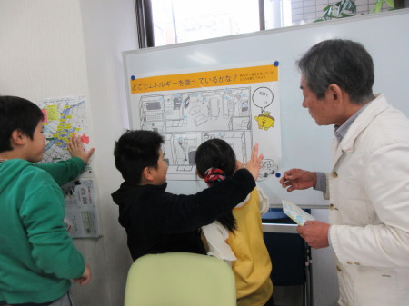 地球温暖化とその対策の話のあと、家庭の中のどこでエネルギーを使っているか、電気・ガス・ガソリン・水を使っているところにシールを貼っていただきました。