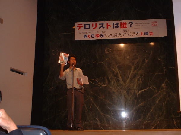 戸田実行委員長の挨拶(手に持ってるのは戦争中毒) |